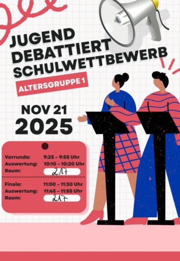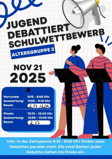Am Freitag – 21.11.2025 – findet der Jugend debattiert-Wettbewerb statt. Dabei debattieren Schülerinnen und Schüler der Altersgruppe 1 (Klasse 8-9) und Altesgruppe 2 (Klasse 10-12) verschiedene aktuelle Themen wie „Sollten Schülerinnen und Schüler ihre Schule selbst putzen?“ oder „Soll eine allgemeine Dienstpflicht für Jugendliche eingeführt werden.“ Zuschauerinnen und Zuschauer sind herzlich eingeladen – dafür bitte eine Voranmeldung an Frau Stürzer.